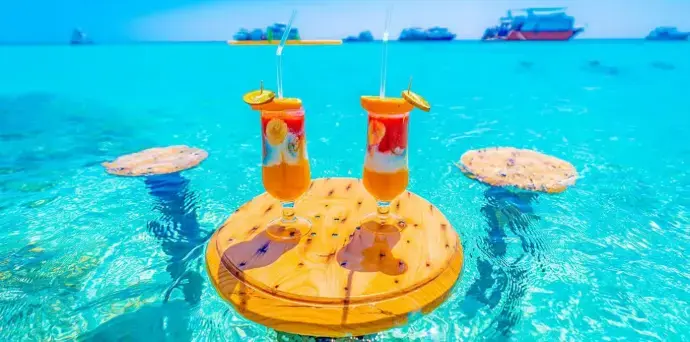 Sobald Sie auf der Insel angekommen sind, entspannen Sie sich in stilvollen Cabanas und auf Sonnenliegen, genießen Sie perfekte Fotomöglichkeiten oder einfach die Sonne und das Meer.
